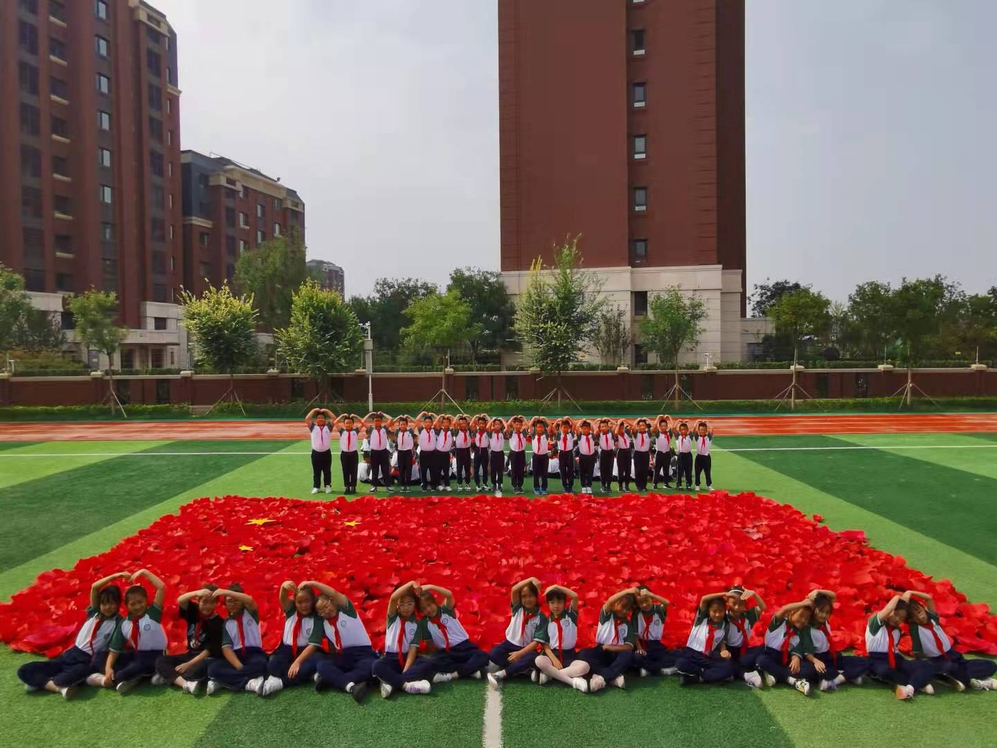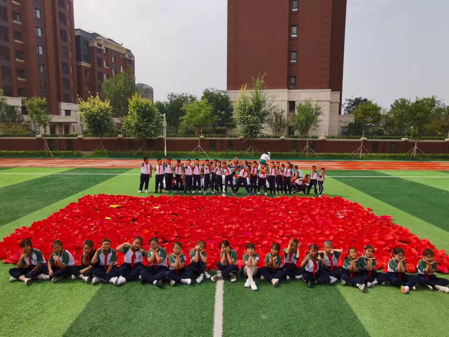 为了迎接国庆节的到来,同学们亲手制作了红花,摆成心形,为祖国母亲庆生。